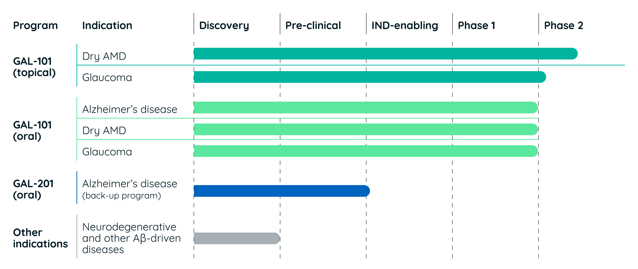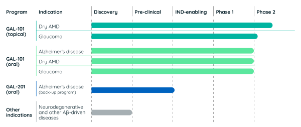 Delivered topically as an eye drop, GAL-101 is designed to provide a patient-friendly treatment, targeting toxic Aβ. An oral formulation of GAL-101 is in early clinical development.