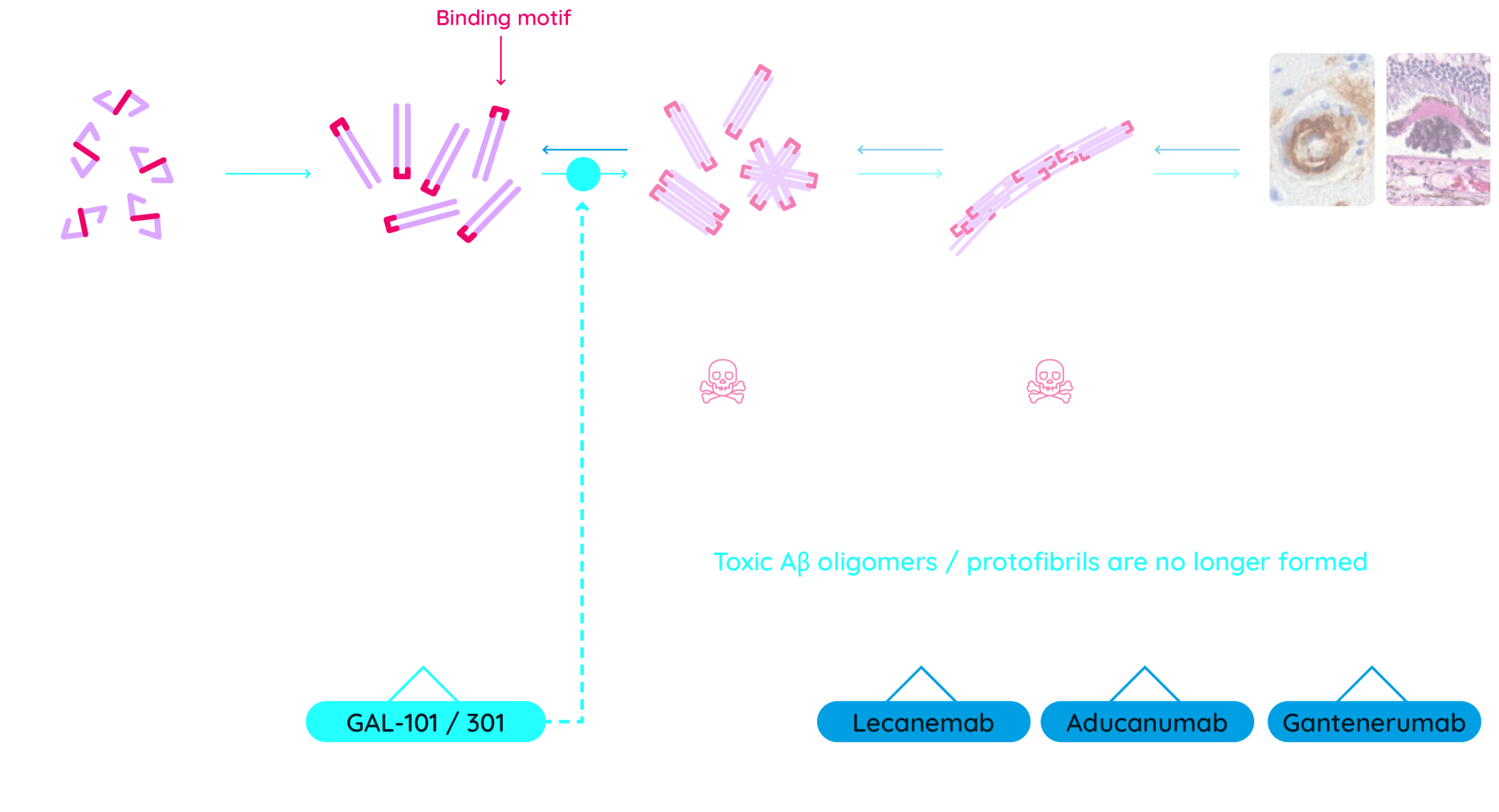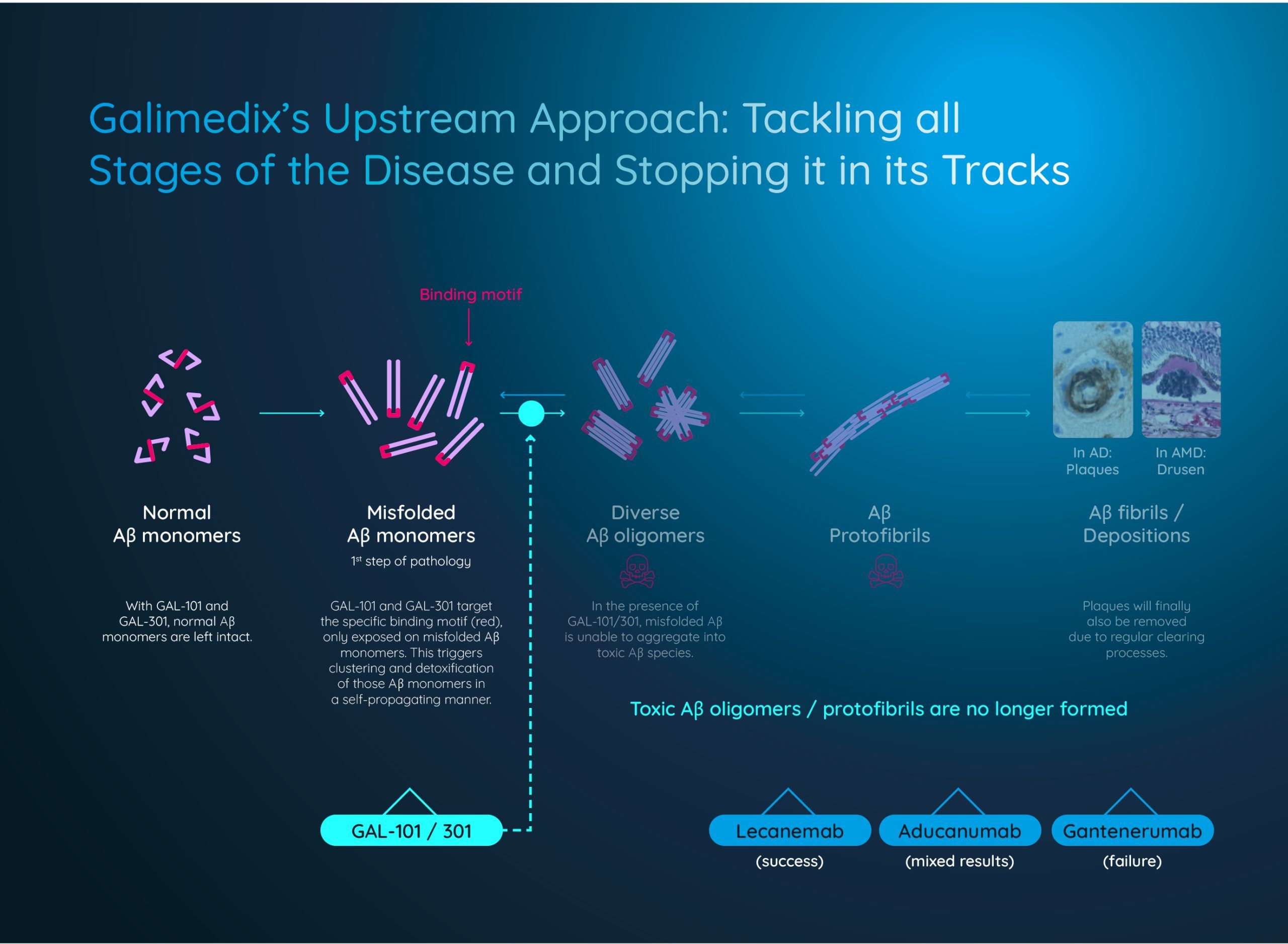 As shown above, Galimedix’s molecules prevent the formation of all toxic Aβ oligomers that drive neurodegeneration at the source by binding to a specific motif only exposed in the misfolded monomers, triggering the clustering of these misfolded Aβ monomers and preventing the assembly of harmful oligomers. These clusters collect and detoxify Aβ.